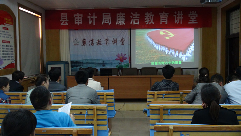为了教育广大审计干部职工树立正确的价值观和严谨的审计职业操守,在全局上下形成“以廉为荣,以贪为耻”的良好风气,积极开展学习一部廉政法规,唱响一首廉政歌曲,观看一部廉政教育片,诵读一段中华传统经典语录,讲述一则廉洁故事以及点评一番廉洁人物事迹等为内容的“廉洁教育讲堂”。图为“廉政教育讲堂”的现场。(李国帅)